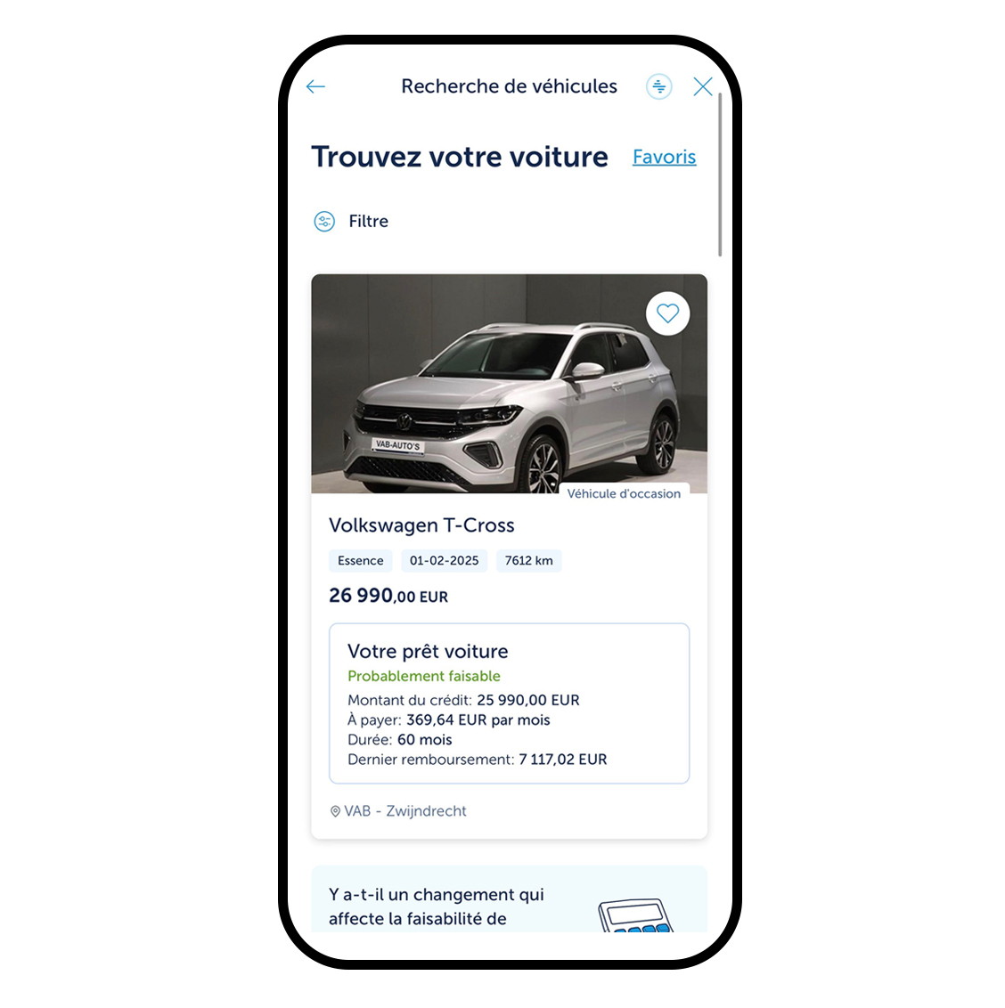 Faites défiler l'offre et découvrez la voiture qui vous convient parfaitement. Envie de savoir si elle entre dans votre budget? MyMobility vous permet de le vérifier facilement: en un coup d’oeil vous savez si la voiture correspond à votre budget.