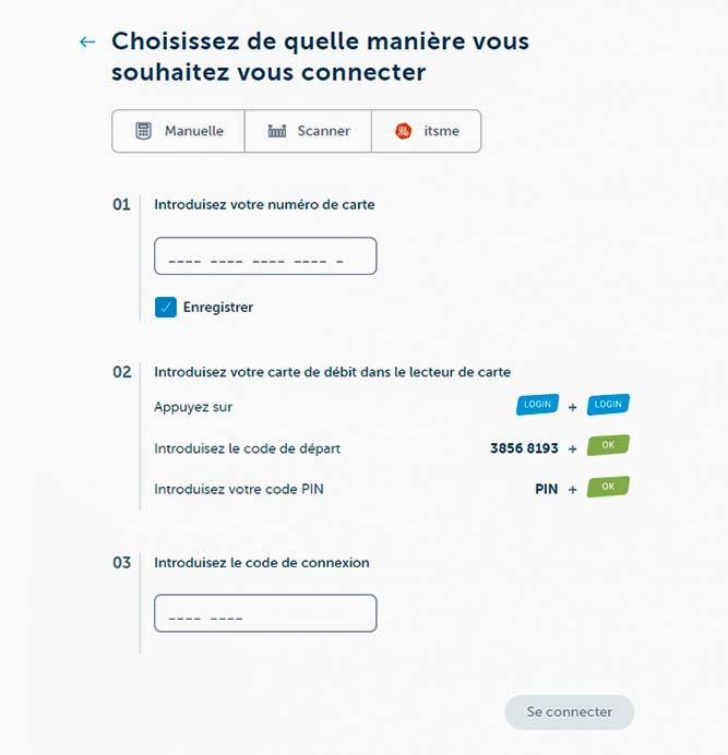 Vous ne pouvez vous connecter qu’à l’aide du code secret que vous avez vous-même choisi et enregistré. Si vous introduisez trois fois de suite un code erroné, vous devrez de nouveau vous enregistrer avec votre lecteur de carte et votre carte de banque. Vous êtes également déconnecté automatiquement après quelques minutes d’inactivité. Restez toujours attentif et ne partagez jamais vos données personnelles, ni vos codes secrets.